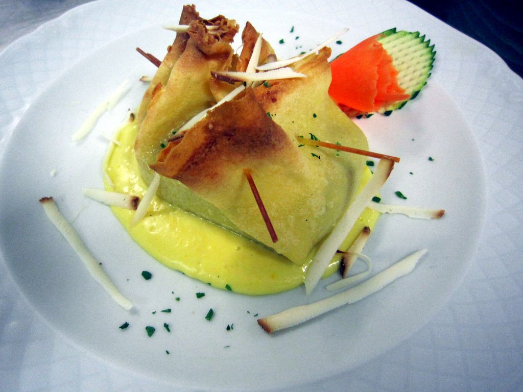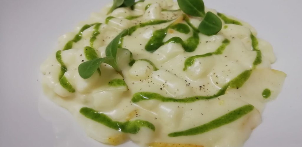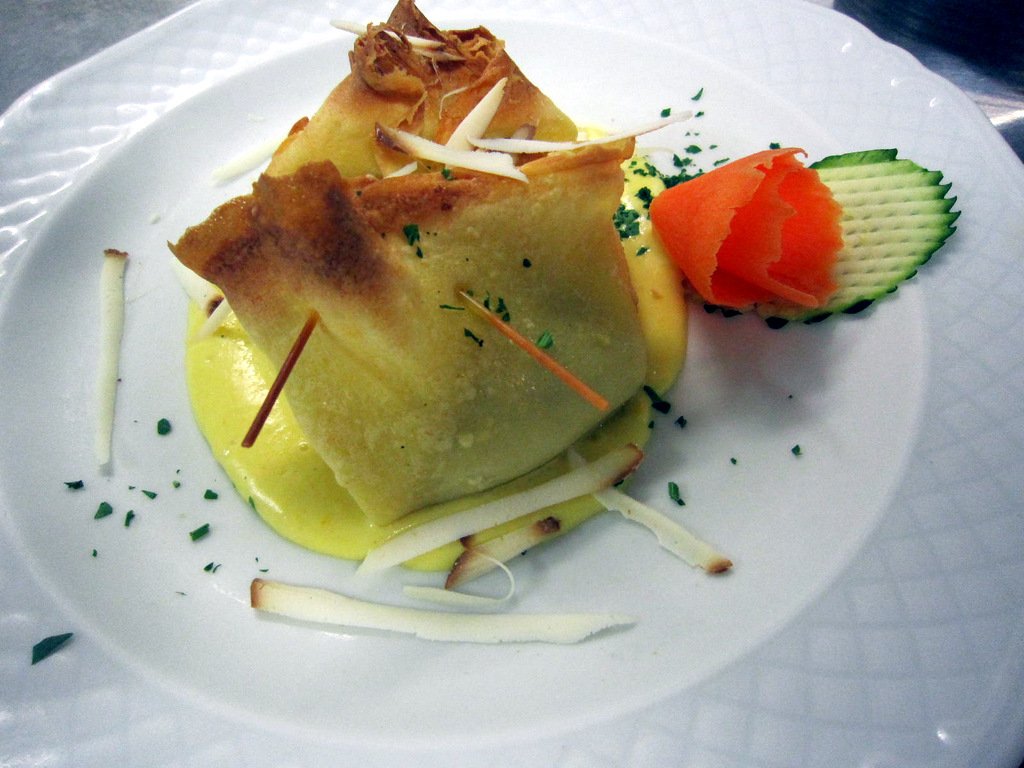 Presentation: Serve by placing the piping hot crepes on a bed of cheese sauce, garnish with a generous amount of ricotta petals.