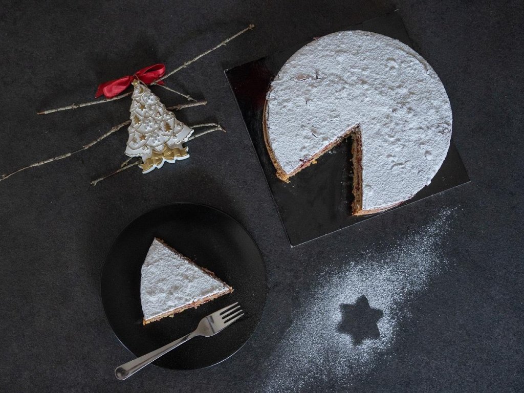 Allow the cake to cool, then cut it horizontally into two layers and fill with red cranberry preserve.