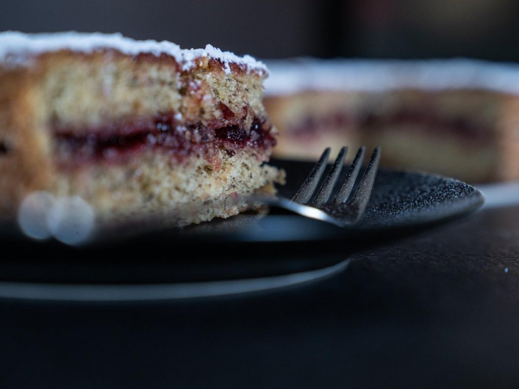 Buckwheat cake with red cranberry preserve